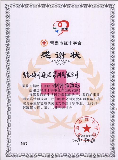 四川抗震救災(zāi)捐款紅十字感謝狀