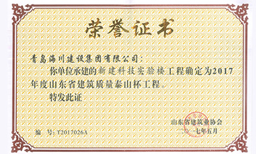 海川集團(tuán)農(nóng)業(yè)大學(xué)科技樓項目榮獲山東省泰山杯2017-05-31海川集團(tuán)七分公司承建的農(nóng)業(yè)大學(xué)科技樓項目近日榮獲山東省建筑工程質(zhì)量最高獎—“泰山杯”。今年4月,山東省“泰山杯”驗收專家組一行4人在市建筑業(yè)協(xié)會負(fù)責(zé)人的陪同下,對我單位申報“泰山杯”的青島農(nóng)業(yè)大學(xué)科技實驗樓進(jìn)行了驗收。青島農(nóng)業(yè)大學(xué)科技實驗樓工程用于科技實驗室和公共平臺實... -