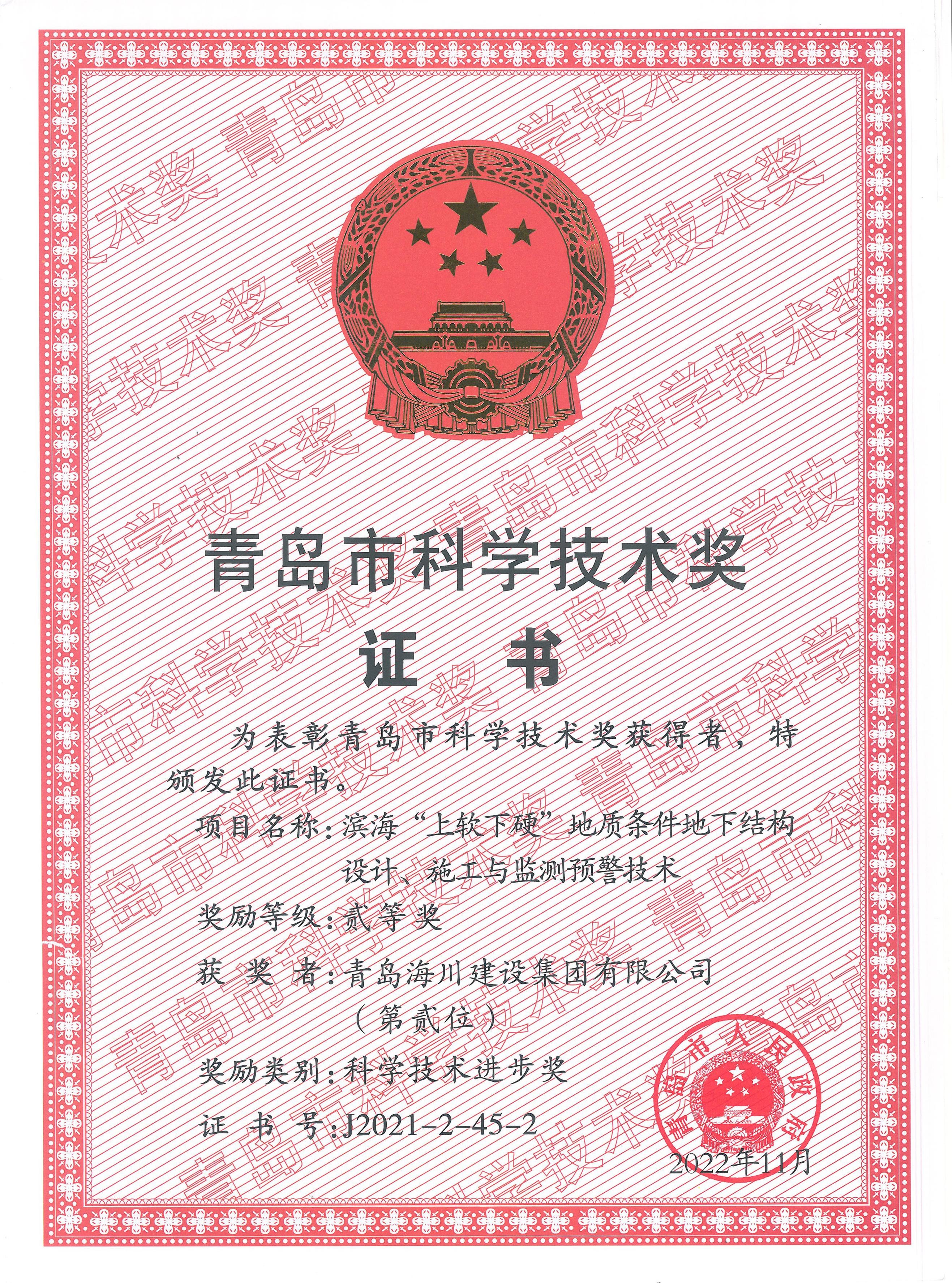 海川集團(tuán)榮獲青島市科學(xué)技術(shù)獎2023-03-06近日,集團(tuán)公司領(lǐng)回了“青島市科學(xué)技術(shù)獎”榮譽證書。經(jīng)青島市市科學(xué)技術(shù)獎勵評審委員會評審、青島市市科學(xué)技術(shù)獎勵委員會核定,市政府決定,由青島理工大學(xué)與青島海川建設(shè)集團(tuán)有限公司聯(lián)合申報的《濱海“上軟下硬”地質(zhì)條件地下結(jié)構(gòu)設(shè)計、施工與監(jiān)測預(yù)警技術(shù)》獲得科學(xué)技術(shù)進(jìn)步獎二等獎。課... -