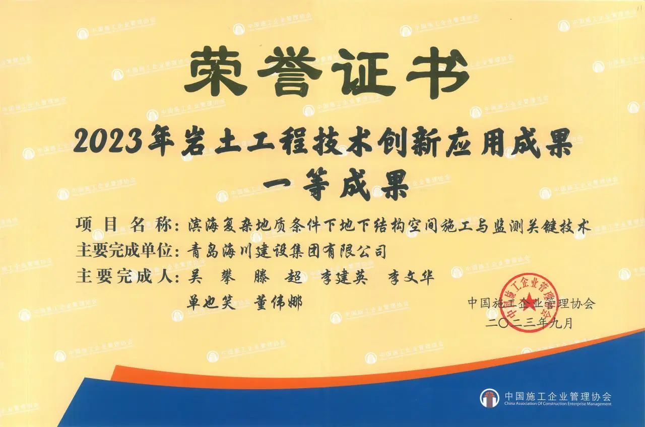 創(chuàng)新賦能 科技爭先 | 青島海川建設(shè)集團(tuán)榮獲多項科技成果獎勵2023-10-08近日,中國施工企業(yè)管理協(xié)會公布了2023年度巖土工程技術(shù)創(chuàng)新應(yīng)用成果的通知,青島海川建設(shè)集團(tuán)研究課題《濱海復(fù)雜地質(zhì)條件下地下結(jié)構(gòu)空間施工與監(jiān)測關(guān)鍵技術(shù)》榮獲一等成果,該成果為集團(tuán)公司首次獲此殊榮,也是本年度青島市唯一一等獎獲獎獎項。近年來,海川建設(shè)始終堅持以科技為本,以... -