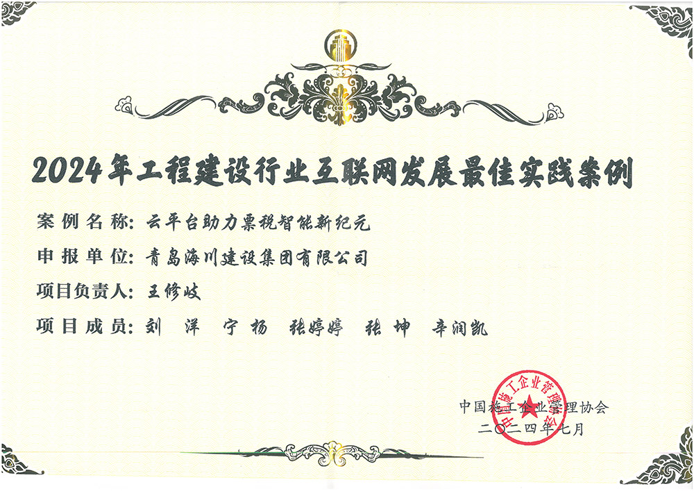 青島海川建設(shè)集團(tuán)榮獲中施企協(xié) “全國工程建設(shè)行業(yè)互聯(lián)網(wǎng)發(fā)展最佳實踐案例”2024-08-31近日,由中國施工企業(yè)管理協(xié)會主辦的中國第九屆工程建設(shè)行業(yè)互聯(lián)網(wǎng)大會在成都舉行,本次大會以“數(shù)字化賦能新質(zhì)生產(chǎn)力發(fā)展”為主題,吸引了來自全國工程建設(shè)、互聯(lián)網(wǎng)、數(shù)字化、智能化等領(lǐng)域?qū)<?、企業(yè)高管及代表超4000人參加。會上,中國施工管理企業(yè)協(xié)會發(fā)布了2024年工程建設(shè)行業(yè)互... -