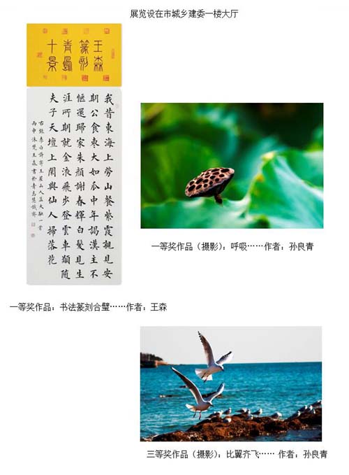 海川集團員工在海川書畫攝影研究會的牽頭下積極參與此次展覽,創(chuàng)作精力充沛,在短短一周內(nèi)創(chuàng)作作品數(shù)十幅。展覽期間,主辦單位共收到各類參展作品294幅,其中:書法類作品83幅,繪畫類作品65幅,攝影類作品139幅,手工才藝類作品7件。在此次展覽中海川集團員工周天馬、丁磊、孫良青、楊興強、寧楊、王森的作品入展并在市城鄉(xiāng)建委一樓大廳展出。這些作品主題鮮明、風格多樣。在展覽后評獎中,孫良青攝影作品《呼吸》獲攝影作品一等獎,《比翼齊飛》獲三等獎;王森《書法篆刻合璧》獲書法類一等獎。
