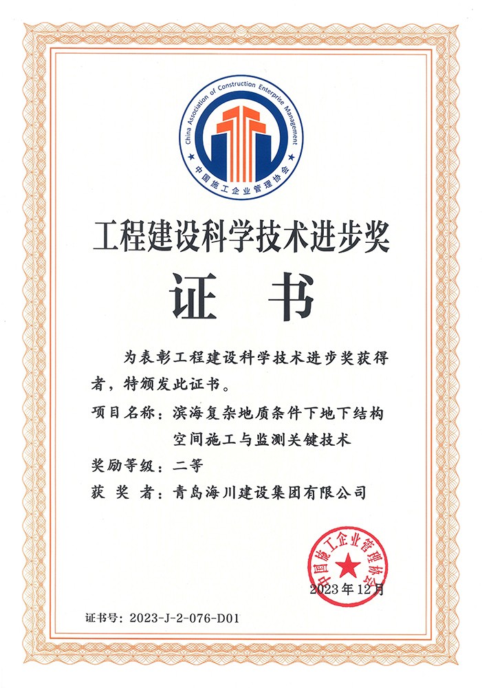 近日,集團(tuán)公司從中國施工企業(yè)管理協(xié)會領(lǐng)回了2023年工程建設(shè)科學(xué)技術(shù)獎成果證書兩項,根據(jù)《工程建設(shè)科學(xué)技術(shù)獎評選辦法(2021年修訂稿)》的規(guī)定,經(jīng)科委辦公室形審、專家網(wǎng)評、科委專家委員會評審、科學(xué)技術(shù)委員會審定和公示,以及會長會議批準(zhǔn),由海川建設(shè)主持的課題《濱海復(fù)雜地質(zhì)條件下地下結(jié)構(gòu)空間施工與監(jiān)測關(guān)鍵技術(shù)》以及聯(lián)合申報課題《青島國際院士產(chǎn)業(yè)核心區(qū)先導(dǎo)區(qū)(生物醫(yī)藥區(qū))項目》均獲得了科技進(jìn)步獎二等獎,本次獲獎,是企業(yè)首次以第一完成單位獲得的國家級社會力量科學(xué)技術(shù)獎,對于推動企業(yè)技術(shù)創(chuàng)新具有重大意義。
